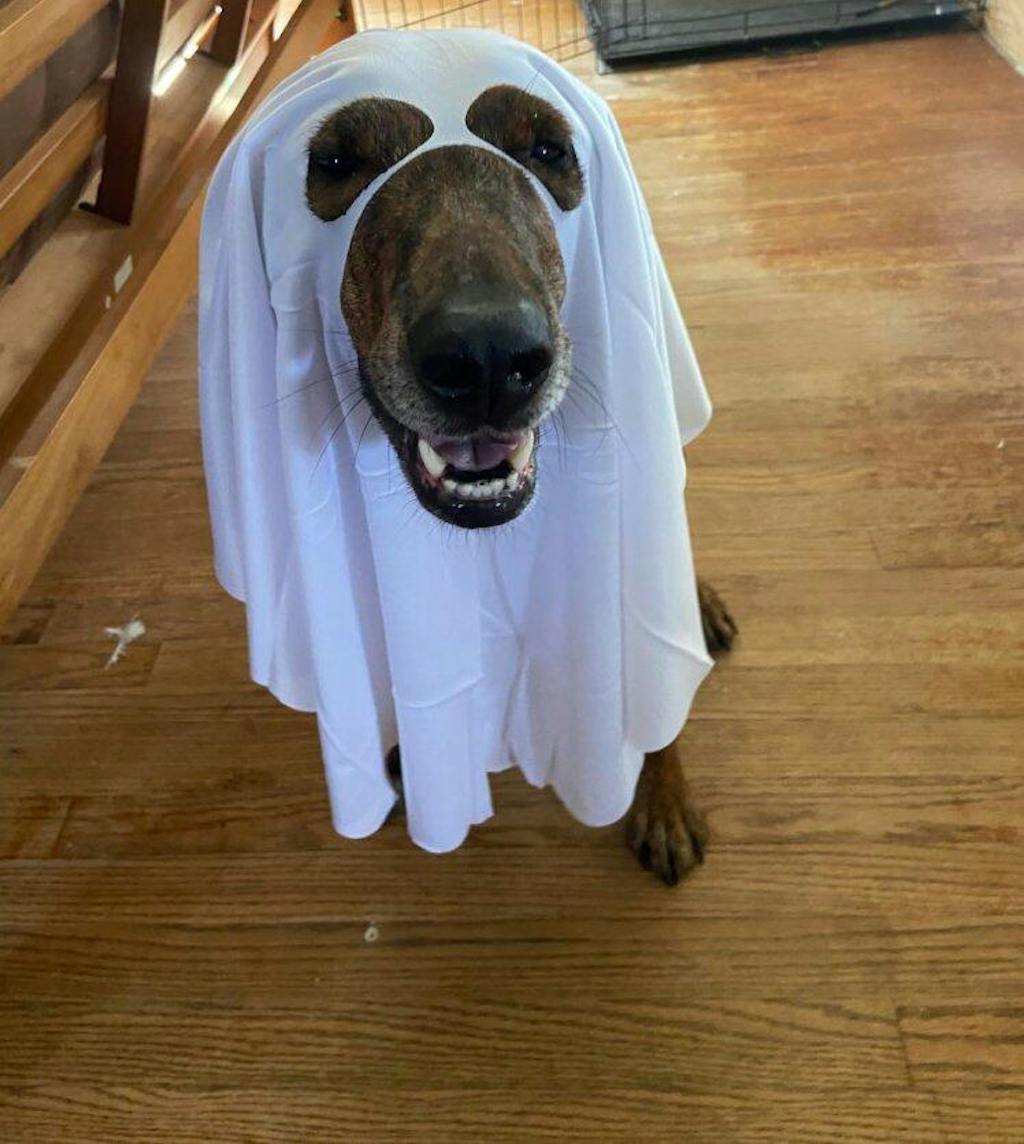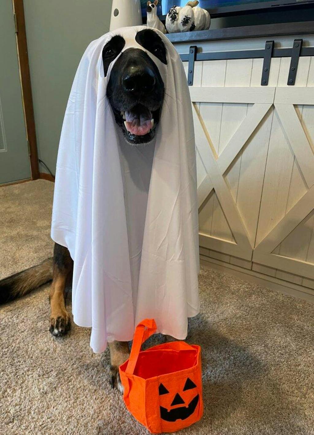Med sin klassiska spöklook i vitt tyg och den medföljande pumpakorgen blir din hund både rolig och charmig. Kostymen är ett riktigt blickfång på Halloween och skapar glada reaktioner vart ni än går.