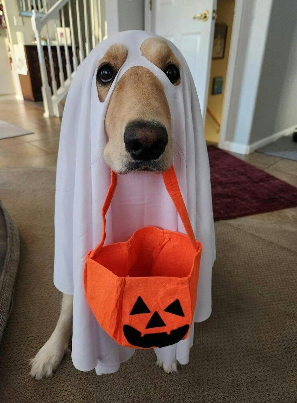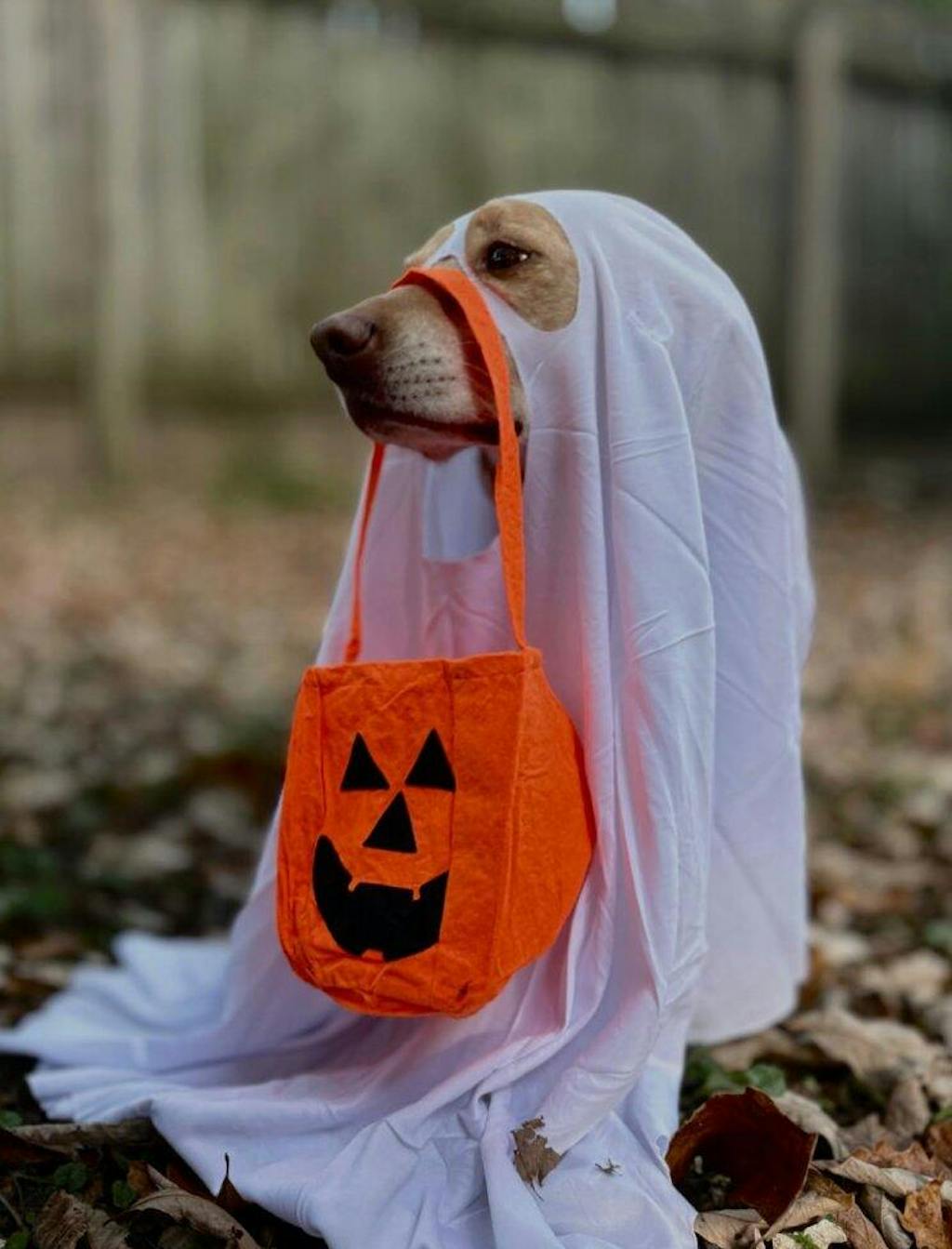 Låt hunden bära pumpakorgen i munnen för extra Halloween-stil.