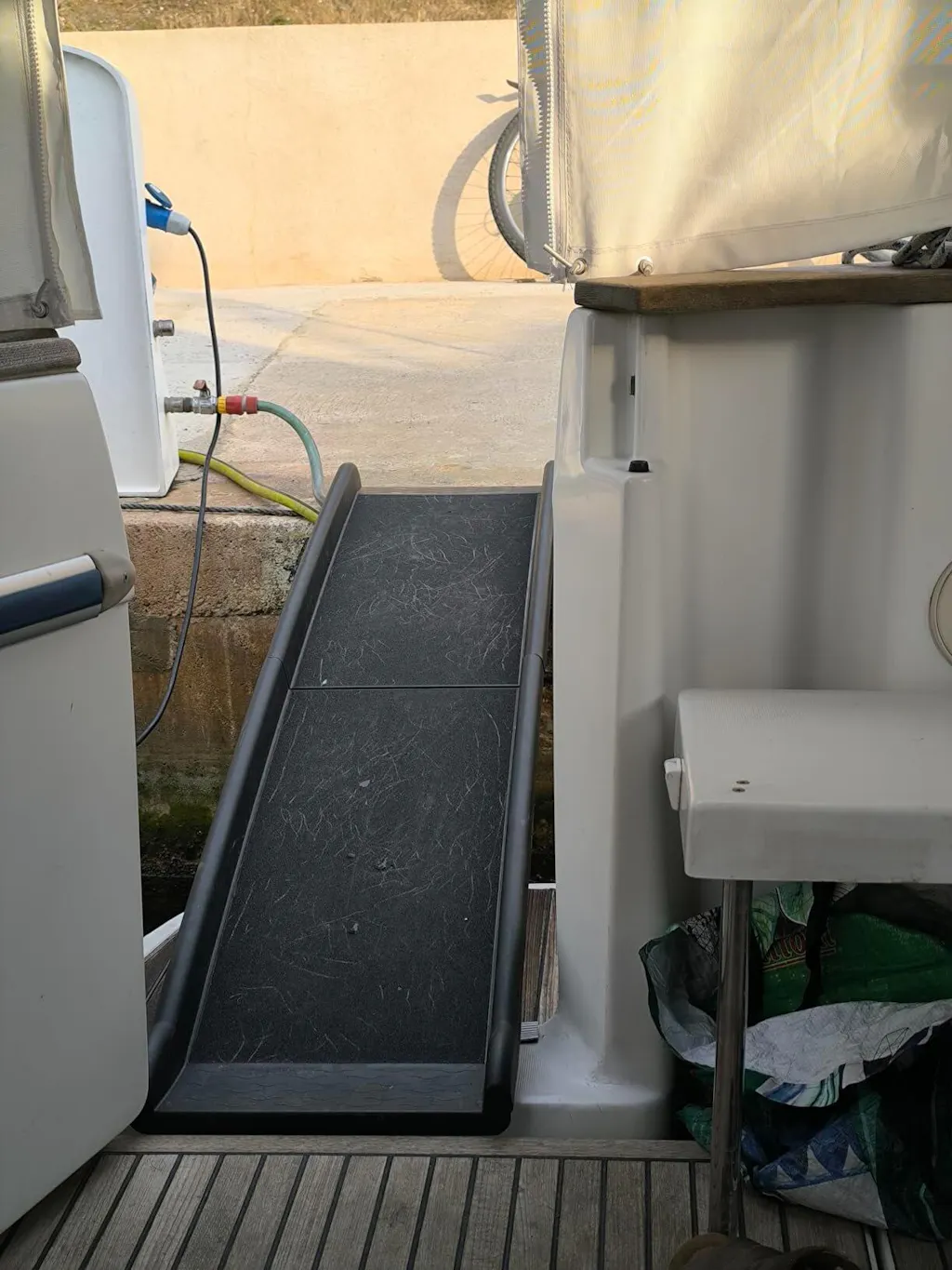 Rampens vikbara design med säkerhetslås gör den enkel att ta med överallt. Den är tillverkad av slitstark plast med sandpappersstruktur för extra grepp. Efter användning torkas den enkelt av med en fuktig trasa.