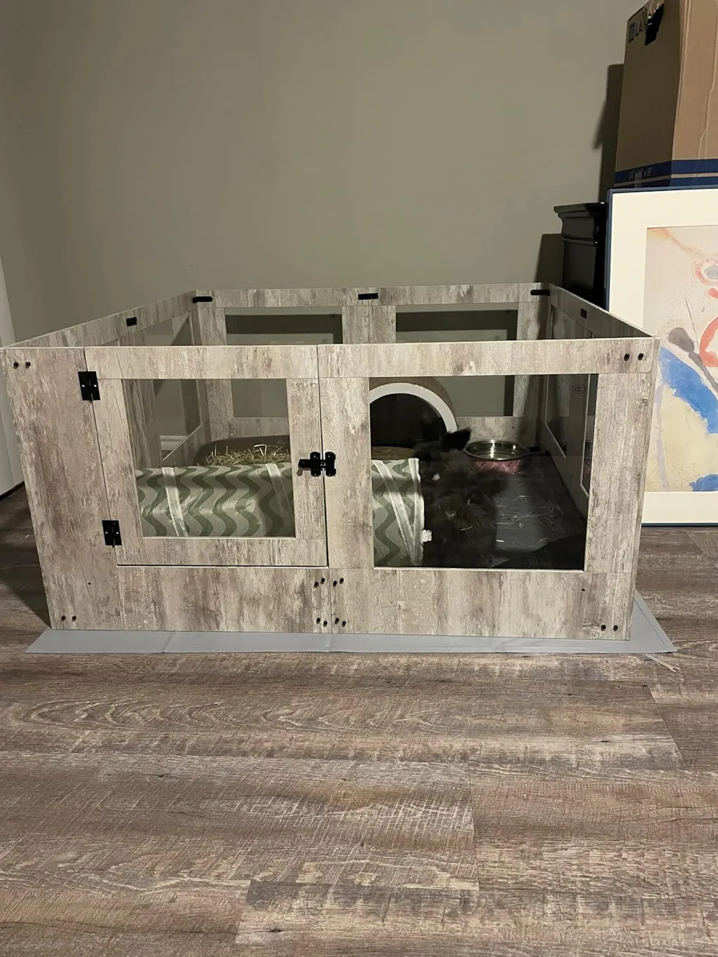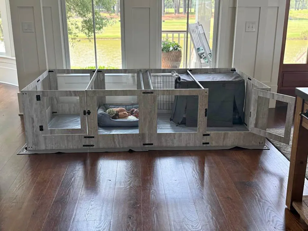 Det medföljande vattentäta underlaget skyddar golvet och torkas enkelt av. Installationen kräver inga specialverktyg och görs med tydlig instruktion. Det transparenta glaset gör att du har full uppsikt över valparna – och skapar en öppen, ljus känsla i rummet utan att göra avkall på säkerheten.