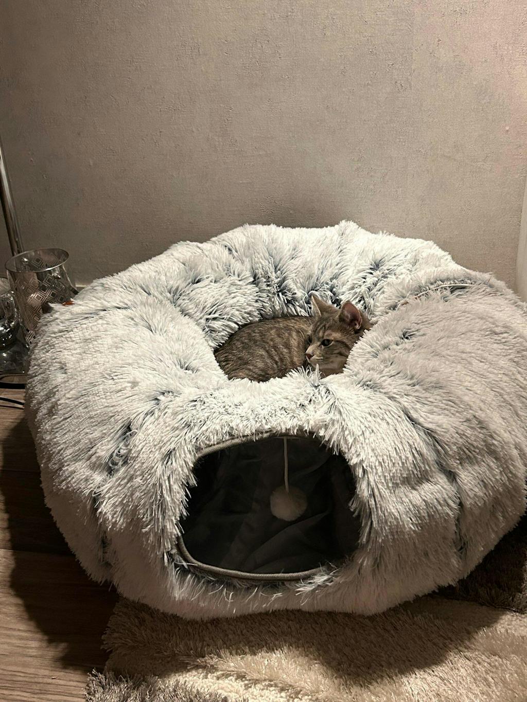 Donut Kattunnelsäng är en 2-i-1 kombination av katttunnel och mysig bädd – den perfekta platsen för både lekfulla äventyr och djup vila.