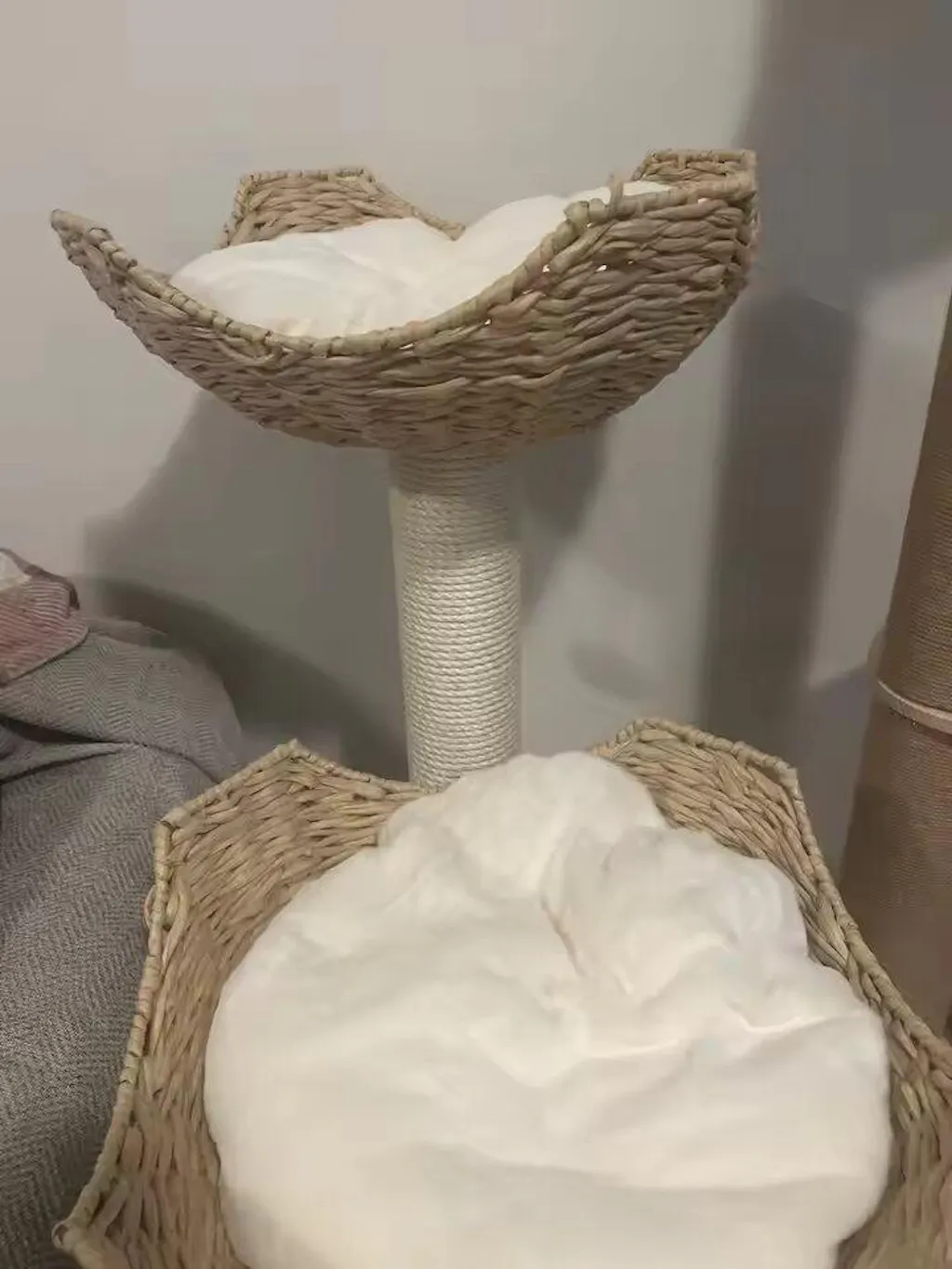 Alla liggytor är försedda med mjuka, vadderade kuddar som kan tas ut och tvättas både för hand och i maskin med tvättpåse. Den nedre sovkojan ger katten en trygg reträttplats, medan de två övre korgarna är perfekta för utsikt och vila i solen.