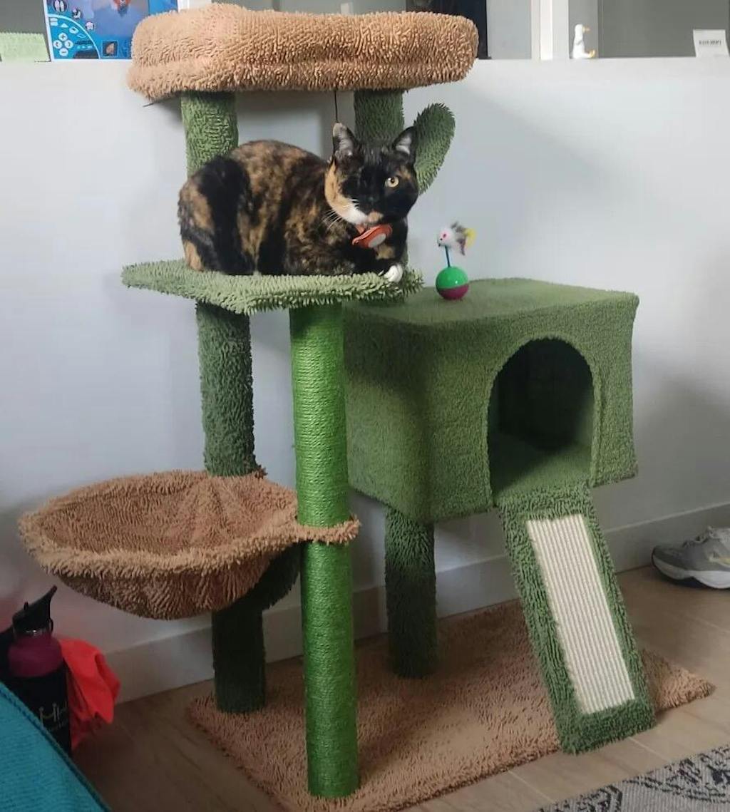 Min katt har ignorerat sina gamla klösplatser sedan jag köpte detta klösträd. Kaktusmotivet verkar vara nyckeln till hennes hjärta – och klorna!