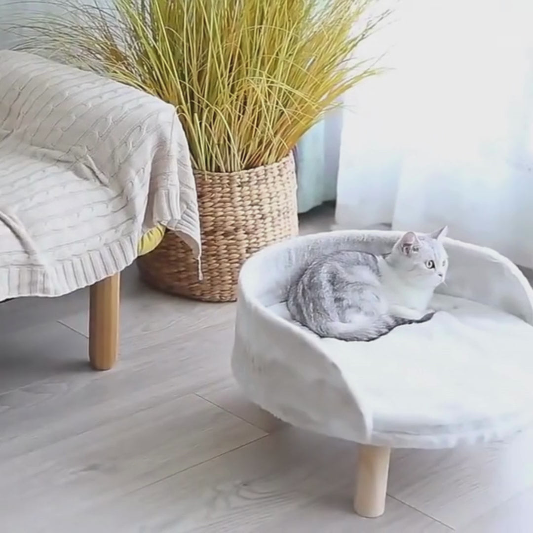 Upphöjd rund djurbädd med ben – en stilren och trygg viloplats för små till medelstora hundar och katter.