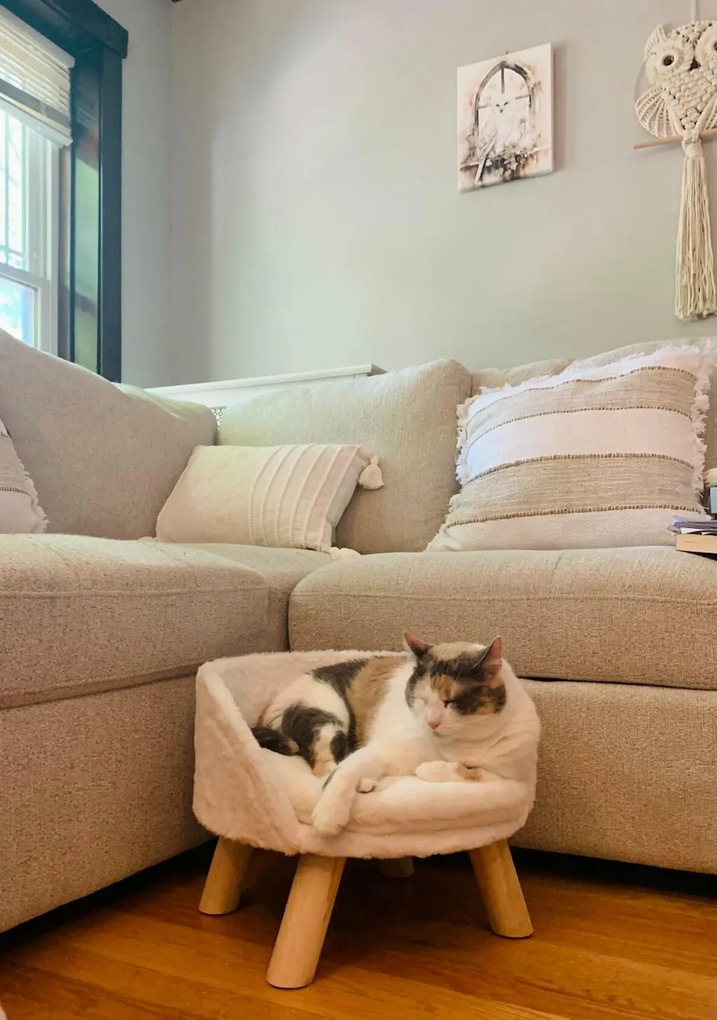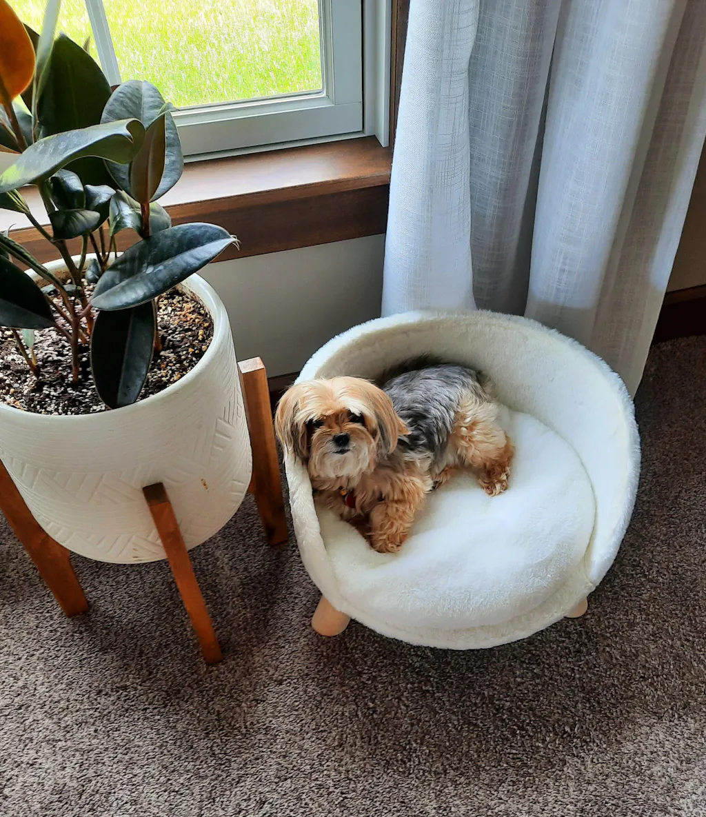 Den rundade formen med öppning framtill gör det lätt för både hundar och katter att hoppa upp – perfekt även för kortbenta eller äldre djur. Ryggstödet ger stöd åt kroppen och skapar en trygg känsla. Den beige färgen smälter in vackert i hemmets inredning och passar lika fint i vardagsrummet som i sovrummet.